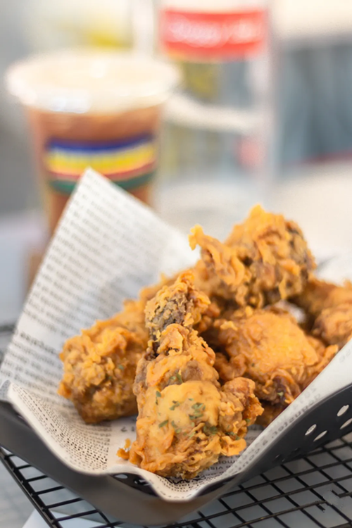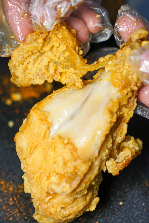 炸得金黄酥脆,可内部的鸡肉依然鲜嫩,一口下去肉汁四溅,吃它!腿的脆皮只有薄薄一层,真是让人好感度upup,吃炸鸡就是要大口吃肉才过瘾~超大一块的炸鸡皮又脆又香,入口还能听见咔吱咔吱的脆响,让你吃过一次就忘不了!