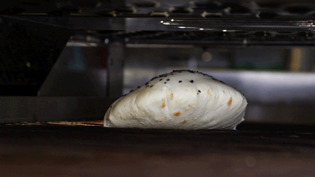 手工制作的汉堡胚经过48小时冷发酵后,进入高温链条炉烤制,经过238 ℃烘烤,圆胖可爱的汉堡胚就诞生啦~