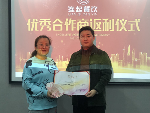 在返利仪式上,连起餐饮执行副总孟凯先生为崔久凤女士颁发“优秀合作商”荣誉称号并给予现金奖励。小编总结了下她的发言,就是要用心,琢磨消费者,按照公司要求的标准化执行操作,提供有温度的服务。