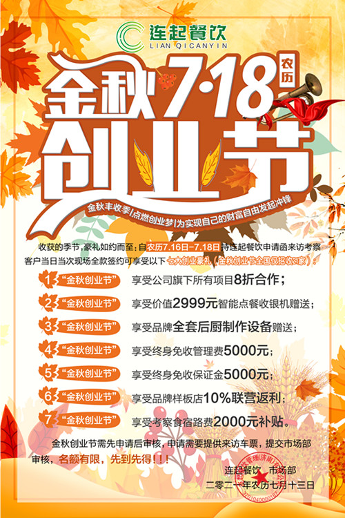 一站式创业运营服务平台连起餐饮,于农历7月16日—7月18日举办“718金秋创业节”,以丰富的开店帮扶举措,降低创业者开店负担,帮助创业者把握开店黄金期。