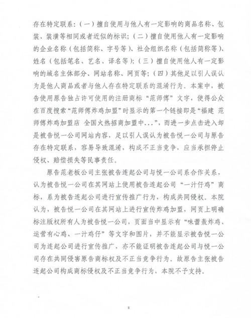 经法院审理查明,本案与连起公司无关,是被告南京悦一网络科技有限公司(以下简称悦一公司)和原告扬州范老板餐饮管理有限公司(以下简称范老板公司)之间的纠纷,连起公司从未委托悦一公司进行推广,连起公司日常经营中从未使用近似或相同商标进行商业推广,没有侵权行为。