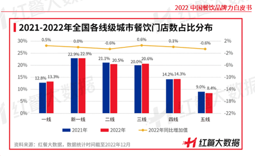 新一线城市餐饮品牌内卷升级,市场竞争加剧,而三、四线城市的下沉市场,正代表着巨大的市场消费机会。据红餐大数据,三线、四线城市连锁餐饮门店数的占比相较于2021均有所上升,2022年许多餐饮票品牌都向下沉市场发起进攻。除此之外,下沉市场的优势也是吸引小城镇创业者的关键,店面小投入少,成本低风险小。